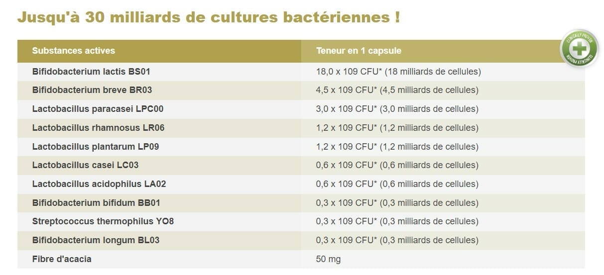 Le supplément contient un mélange exclusif de souches probiotiques, dont Lactobacillus acidophilus, Bifidobacterium bifidum et Lactobacillus plantarum. Ces souches sont choisies pour leur capacité à survivre à l’acide gastrique et à atteindre l’intestin vivant.
